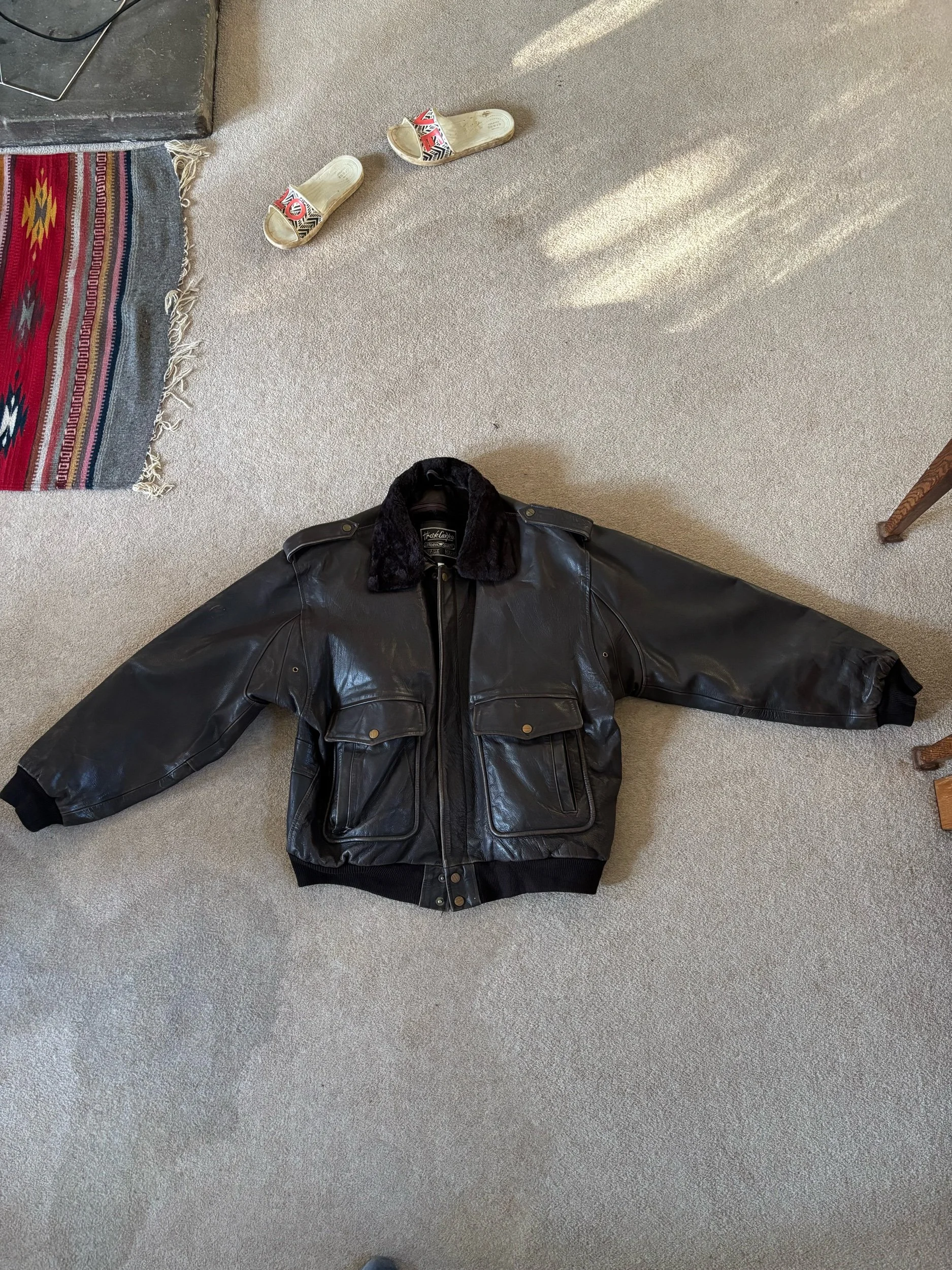 A vintage Thoré Canyon leather jacket with synthetic shearling zip inner liner and collar cover for extra warm. In XXL size